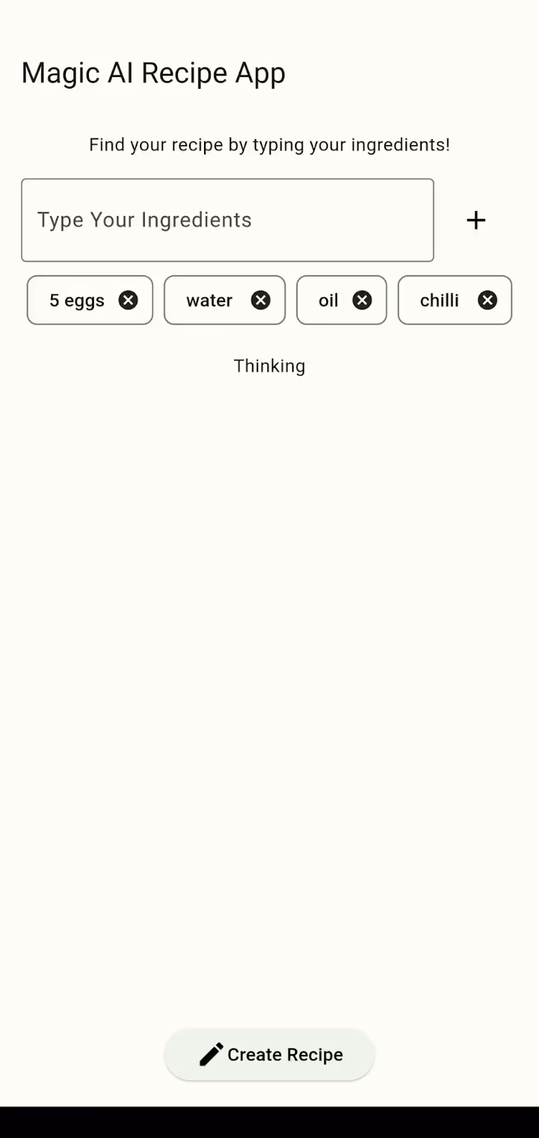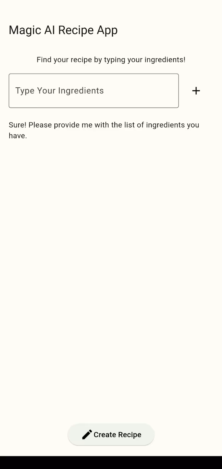 This is the main screen of the app where you will type the ingredients and hit enter, and then tap the create recipe button.