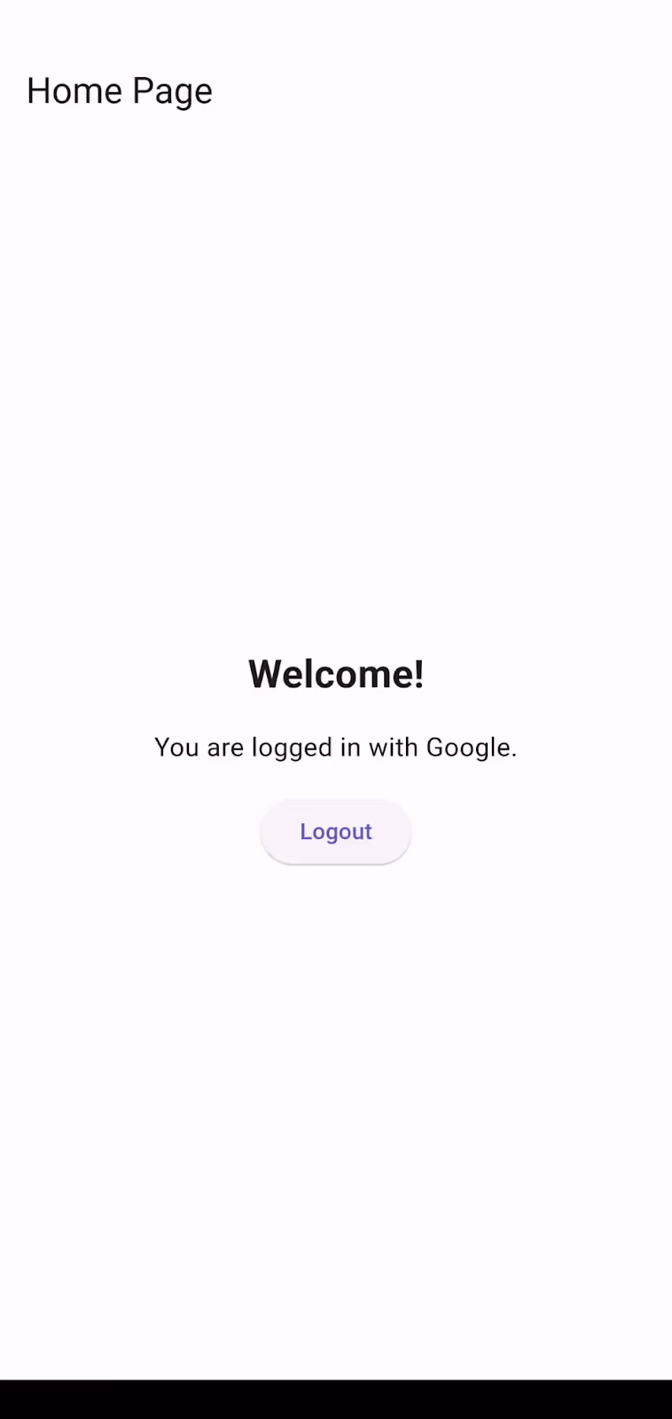 If the user is successfully created, The screen navigates to this “HomeScreen” where you can perform any actions you want. Currently we are just showing a logout button, which logs-out the current user and takes us to the login page.