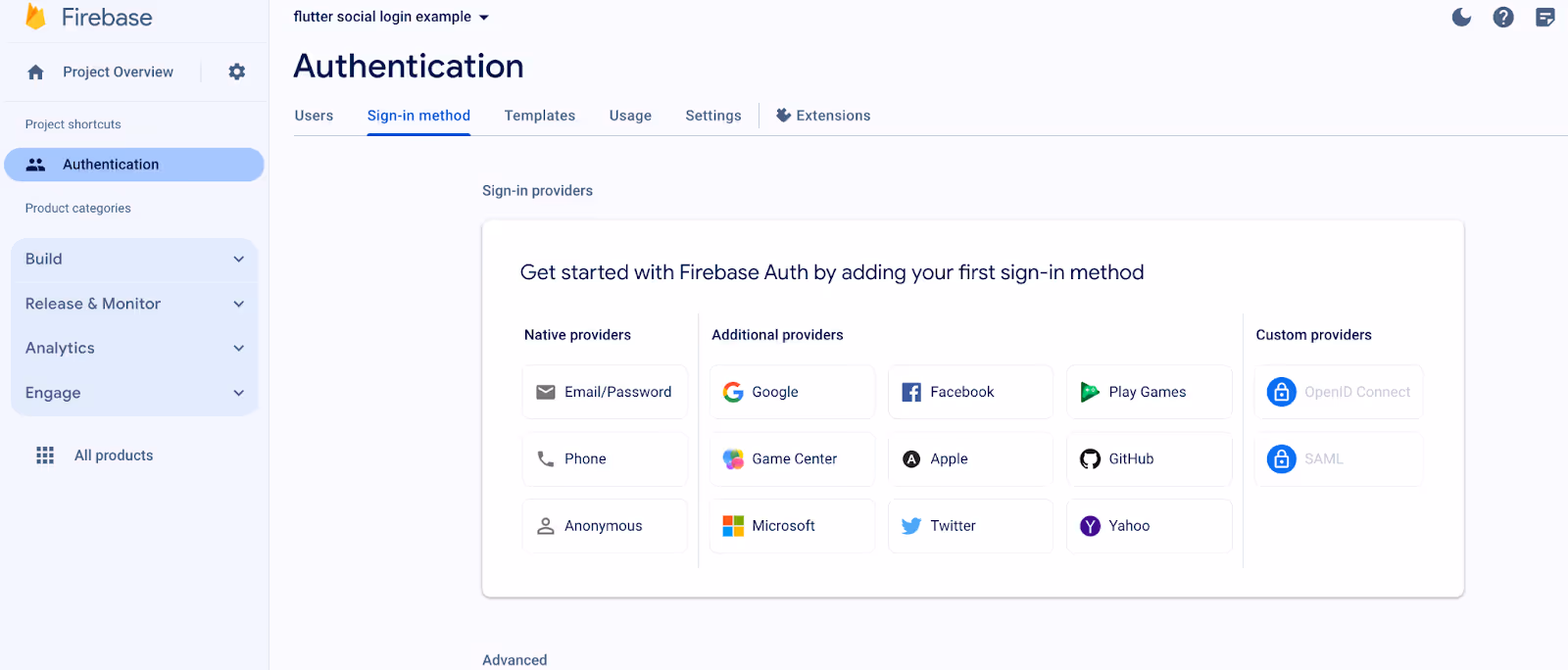 Goto to your browser and open Firebase Console (console.firebase.google.com) and create a new project. Follow the instructions to set up your project, including enabling required authentication providers such as Google and Facebook.