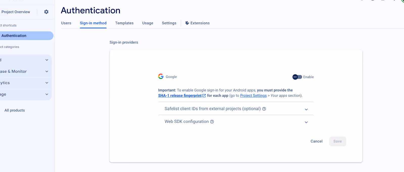 But to be able to use google authentication, you need a SHA key for your project, you can follow the instructions given on the firebase console.