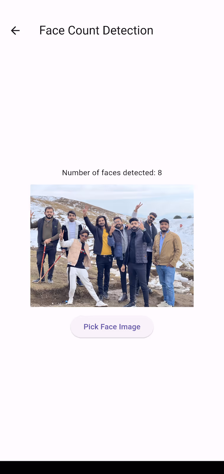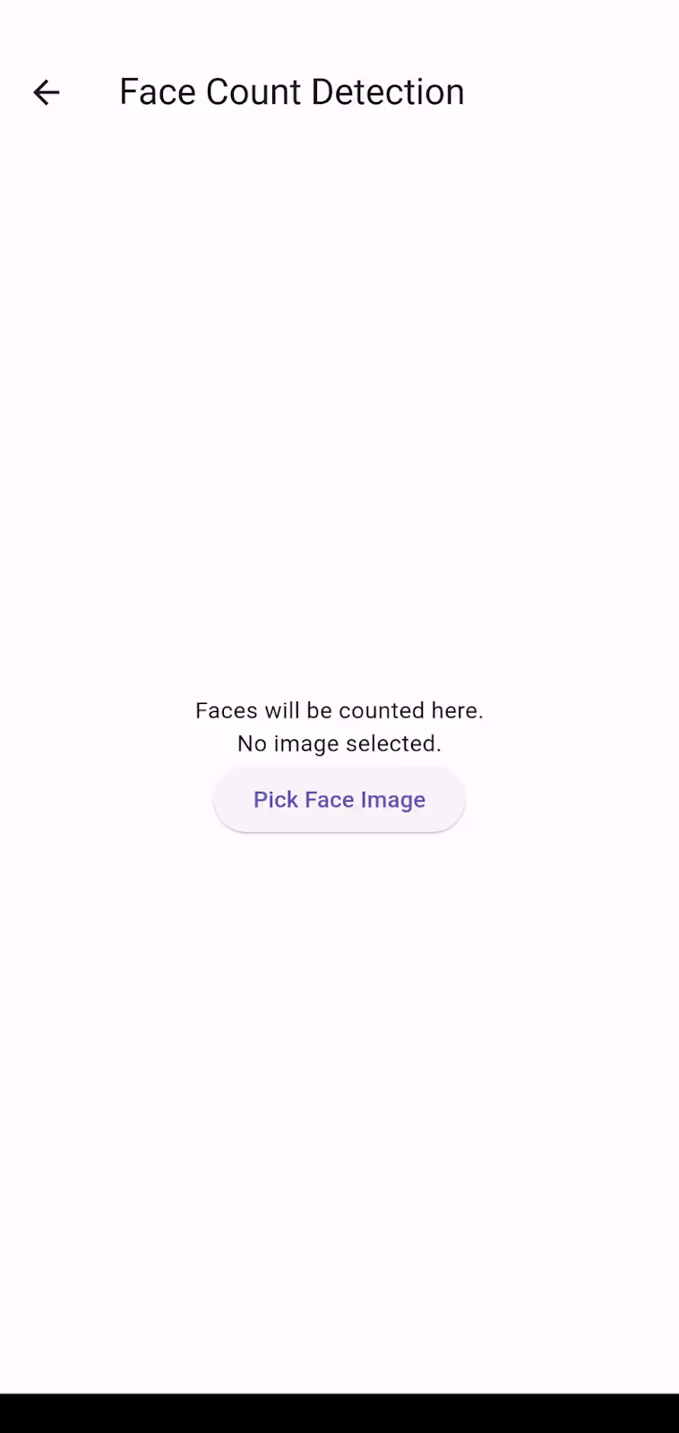 - Face Count Detection from an image Users can choose any image and the results will be displayed on the screen.